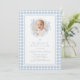 Modern Blue Gingham Bow Photo Boy Baptism Invitation. For best results upload a square image of the baby.