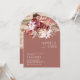 Modern arch wedding invitation with your photo framed by burgundy and blush boho florals on a dusty rosewood background — timeless, elegant, and easy to personalize.