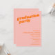 This graduation party invitation features a bold retro "graduation party" headline in orange on a bright pink background. All the event details — graduate's name, school, class year, date, location, and RSVP info — sit in the lower half in clean orange lettering. A great fit for a girl grad who wants something bold, colorful, and fun for her celebration.