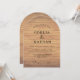 rustic wedding invitation features a trendy arch-shaped design with a warm, natural wood grain background. It perfectly combines elegant serif typography with a cozy, country-chic aesthetic for a modern outdoor wedding.