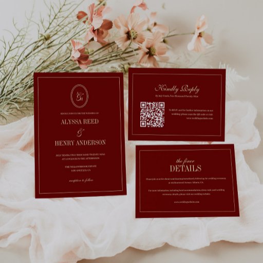 Modern Monogram Classic Wine Red Wedding Invitation. Personalize this elegant dark wine red and cream wedding invitation with bride and groom names and initials, your wedding date, and location.