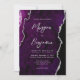 This elegant wedding invitation features a background image of purple watercolor agate trimmed with faux silver glitter. The customizable text combines silver-gray modern handwriting, copperplate and italic fonts. The reverse side features a coordinating purple and silver agate design.