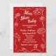 This playful and appetizing design bursts with fun energy on a vibrant red background, featuring whimsical white line art doodles of pizza slices dripping cheese, a margherita pizza, pizza paddle, maracas, mushrooms, tomatoes on the vine, a teddy bear, and a baby bottle for a cheeky food-meets-baby twist. 🍕🍼 The hand-drawn style adds a lively, hand-sketched charm with swirling vines and bouncy elements, creating a joyful, celebratory vibe full of humor and delicious anticipation perfect for a girl's lively shower. ✨
