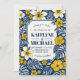This modern wedding invitation features a stunning arrangement of blue and yellow watercolor flowers, creating a fresh and elegant floral aesthetic. The soft watercolor blooms pair beautifully with an elegant calligraphy script, adding a refined and sophisticated touch to your special day.