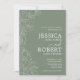Invitación botánica moderna a la boda en color verde oliva sabio y blanco. El diseño simple de boho incluye acentos florales de contorno dibujados a mano, tipografía de escritura y monograma en la parte posterior de la tarjeta. Invitaciones Zazzle impresas o una plantilla imprimible digital de descarga instantánea.