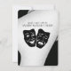 Diseño teatral muy elegante en un diseño moderno en blanco y negro. Este no es su diseño diario, sino un fabuloso diseño artístico que es perfecto para un evento teatral. Todo el texto se puede personalizar para que diga lo que desee. También puede eliminar áreas de texto. La máscara de teatro griega para la comedia y la tragedia está en ambos lados. Esta invitación creativa seguramente atraerá a la gente y será una cierta pieza de conversación en los próximos años.