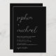 Este exquisito diseño de invitación a la boda combina el minimalismo moderno con el estilo romántico, con un llamativo fondo negro que hace pop la tipografía blanca. Los nombres de la pareja se resaltan con gusto en un guión elegante y fluido, mientras que todos los detalles esenciales del boda se presentan en una fuente serif limpia y legible. Esta estética sofisticada y atemporal ofrece un cautivador adelanto de su día especial, prometiendo encantar a sus huéspedes.