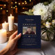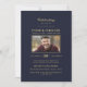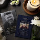 Celebración Moderna De La Invitación De La Vida De La Marina Funeral Azul Y Oro Foto. Fácil de editar la plantilla de invitación al funeral con dos fotos delante y atrás en azul marino y oro falso. Personalice la invitación para funerales digitales de descarga instantánea con imágenes.