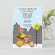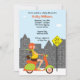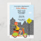 Esta invitación única de la fiesta de bienvenida al bebé ofrece a una mujer embarazada que lleva a cabo montar un ciclomotor colorido en la ciudad. Esta invitación apenas está esperando para ser modificada para requisitos particulares con sus detalles. Diseño de la estrella del bebé de algunos elementos