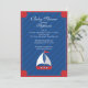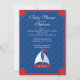 Moderno barco náutico Baby Shower Invitation con un barco de vela azul y rojo situado en un fondo azul con una carpa roja. Perfecto para una ducha de bebé o un bebé. ducha de bebé chica. Visite nuestra tienda para ver nuestra amplia selección de ninos náuticos en velero. invitaciones para ducha. ©diseños de hojas negras