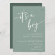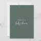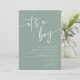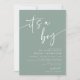 Es una invitación a la ducha de bebé de Boy que tiene un diseño minimalista elegante, una paleta de color verde sabio y un tipo de letra moderno. Esta invitación contemporánea es fácil de editar y es perfecta para una moderna ducha de bebé boho para un niño.