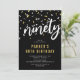 Invitaciones modernas para cumpleaños número 90 con un fondo negro elegante, confeti blanco y dorado, el título 'noventa' en una fuente de letra cursiva en negrita y una plantilla de texto simple que es fácil de personalizar.