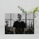 Simple invitación de graduación con la foto horizontal del graduado con "Graduado" exhibida en Relieve metalizado dorado con letras modernas de arte deco. Personalice la parte delantera de la invitación de graduación con fotos agregando el nombre del graduado, la escuela y el año de postgrado. La invitación se invierte para mostrar un diseño giratorio geométrico en blanco y negro.