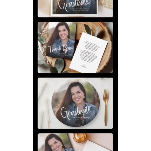 Una invitación de graduación de foto de guión de moda. Se puede personalizar todo el texto de la parte delantera y trasera de la tarjeta. Intercambie la foto con una foto del graduado para crear la invitación perfecta de graduación.