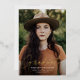 Celebra el grado con nuestra elegante invitación de graduación de fotos. La invitación de graduación muestra la foto vertical del graduado con "Graduado" en una descripción real de la caligrafía de Relieve metalizado dorado. Personalice el frente de la moderna invitación de graduación agregando el nombre del graduado, el nombre de la escuela y el año de graduación. La invitación se revierte para presentar un diseño geométrico punteado en blanco y negro a la moda. El diseño es perfecto tanto para graduados de secundaria como universitarios.