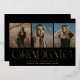 Esta moderna invitación de graduación de tres fotos presenta elegante tipografía "graduada" en Relieve metalizado de oro levantado con tres fotos en un fondo negro. En la parte de atrás hay un texto de invitación para la fiesta de graduación / open house que también puede ser borrado si no es necesario. Los colores de fondo y texto son todos personalizables. Este diseño sencillo pero elegante permite que las fotos brillen al mantener los detalles mínimos.