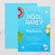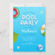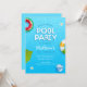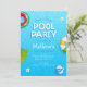 Es una tarjeta de invitación para fiesta de verano junto a la piscina fresca y moderna. Ideal para la invitación de cumpleaños de verano. Tiene hojas de palma y una piscina azul con tipografía divertida. Todo el texto es fácilmente personalizable.