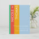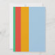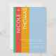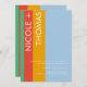 Esta moderna y minimalista invitación a la boda incluye audaces rayas verticales en verde, rojo y amarillo, ambientadas con un relajante fondo azul claro. El diseño combina tipografía limpia con un toque personal, mostrando los nombres de la pareja en un tipo de letra manuscrita. Los detalles restantes están en un estilo sans-serif elegante. El diseño es sencillo, está alineado a la derecha y es fácil de leer, lo que permite que la personalización se adapte a sus detalles bodas únicos. Perfecto para parejas que aman colores vivos y una estética moderna, esta invitación puede ser diseñada para reflejar su día especial.