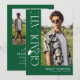 Celebre a su graduado con un estilo atemporal y elegante con esta moderna invitación de graduación verde y blanca. Contra un fondo verde elegante, el diseño presenta una tipografía "GRADUADO" serif blanca y moderna que corre verticalmente hacia abajo, creando un punto focal refinado. Un icono de gorra de graduación elegante se sienta sobre la "R", mientras que la cola fluida de la letra se transforma en una borla elegante que guía la vista hacia una foto destacada del graduado.