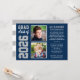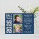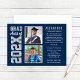 Anuncie su clase de 2022 con estilo de graduado de secundaria con esta invitación de graduación multifoto e invitación de fiesta. La tarjeta "Ahora y después", de dos caras, muestra dos fotos del grado (una imagen actual y otra más antigua de su primer día de escuela) con un diseño simple y masculino con letras inspiradas en jersey deportivo. Los colores azul marino, gris plateado y blanco se pueden personalizar para que coincidan con los colores de la escuela. Un patrón de rayas blancas se viste por la parte posterior de la tarjeta. *Consejo de fotos: recorta tus fotos en una forma cuadrada antes de subir.