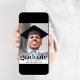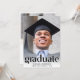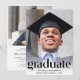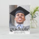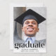 Una elegante invitación a una fiesta de graduación que muestra la foto del graduado con "Graduado" en letras grandes y de moda y su nombre, colegio y año de clase en una tipografía simple. En la parte posterior, añada una foto adicional y los detalles de su fiesta.