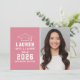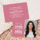 Anuncie su graduado de secundaria o universitario con estilo con esta invitación de graduación e invitación a la fiesta. La tarjeta de dos caras presenta un retrato senior del graduado con tapa de grado y diseño de tipografía blanca simple y moderno. El fondo rosado se puede cambiar a un color diferente con la función "Personalizar It", a continuación Editar / Fondo para seleccionar otro color.