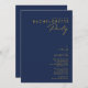 Esta moderna y mínima invitación a una soltera dorada azul marino es perfecta para su elegante fiesta de soltera boho. Su diseño abstracto, sencillo y único, acompañado de un guión minimalista contemporáneo y una paleta de colores azul marino oscuro, le confiere a este producto un toque elegante y formal de lujo al tiempo que se mantiene simplista, bohemiana de moda. Manténgalo como está, o elige personalizarlo con obras de arte o gráficos de su elección!