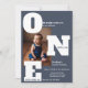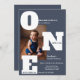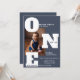 Una invitación moderna y audaz para el primer cumpleaños en un rico azul polvoriento, con letras "ONE" sobredimensionadas para un diseño limpio y llamativo. Personalízalo con tu propia foto para que sea única tuya. Una opción excepcional para aquellos que buscan una alternativa sofisticada a las tradicionales "demasiado lindas" invitaciones temáticas para bebés.