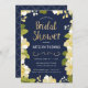Esta moderna y bonito invitación a la ducha de novias tiene un borde floral ilustrado y las palabras "Bridal Shower" en oro (Relieve metalizado simulado). El fondo es de color azul marino, pero puede personalizarse según el color que elija. La parte posterior de la invitación incluye un patrón de quatrefoil dorado (Relieve metalizado simulado) con un fondo azul que también puede cambiarse. El texto es el personalizable de su evento especial de celebración pre-boda.