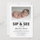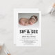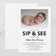 Invitación minimalista para fiesta de sip and see con fondo blanco, foto y plantilla de invitación moderna que se personaliza fácilmente. Todos los estilos y tamaños de fuente se pueden cambiar fácilmente haciendo clic en el enlace de personalizar más después de personalizar.
