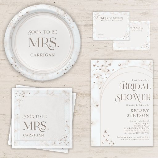 Las modernas y elegantes invitaciones a la ducha de novias con perlas blancas son el complemento perfecto para cualquier ducha de novias con un tema de perlas y prosecco. Estas invitaciones tienen un diseño neutro de mármol y perlas que combina a la perfección con el resto de los materiales y decoración de la ducha de matrimonio.