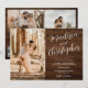 Una moderna, moda y elegante invitación a la boda con nombres personalizados con caligrafía escrita a mano en madera marrón rústica vintage, añada 3 fotos y tu código qr para escanear una invitación todo en uno con detalles, rsvp y alojamiento. Todos los colores del texto, los nombres y el fondo son personalizables. Una invitación simple y minimalista.