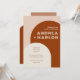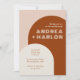 Una moderna invitación a bodas boho que da un ambiente retro brillante y divertido con sus diseños groovy arcos abstractos que rompen un pop de color marrón, naranja y terracota con letras en negrita.