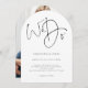 Moderno Escribimos Forma De Arco De Boda Fotográfico. Un diseño sencillo pero elegante con tipografía negra sobre un fondo blanco clásico. Guión de conjunto elegante que hacemos ocupa el centro del escenario en la parte superior. El resto del texto que puede personalizar fácilmente. Los colores del texto y del fondo pueden cambiarse si desea adaptarse mejor a su tema boda a través de la opción personalizar. Reemplace la imagen de ejemplo en la parte posterior por la suya propia.