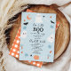 Invitación de Baby Shower de Halloween Blue Modern Little Boo Cute a los chicos con temas de Halloween la invitación a ducharse con bebés azules, naranjas, negros y blancos, con algunos fantasmas, murciélagos, estrellas y una calabaza.