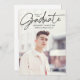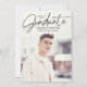 Anuncie su graduación con estilo con esta moderna y minimalista invitación a la fiesta de graduación. Con su foto vertical senior, este diseño destaca "Graduado" en un elegante guión manuscrito negro colocado cerca de la parte superior, creando un aspecto elegante y sofisticado. Personalice el frente con su nombre, escuela y año de graduación para un toque personalizado. La parte posterior muestra una foto horizontal con los detalles de tu fiesta de graduación que se muestran a continuación. Perfecto para graduados de secundaria y universitarios, esta moda y esta invitación atemporal marca la pauta para una celebración memorable.