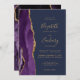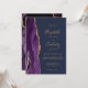 El borde izquierdo de esta elegante y moderna invitación a la boda incluye un borde de ágata color morado adornado con un falso purpurina de oro. El texto del personalizable combina la escritura a mano de color dorado, las fuentes de copperplate y las tipografías cursivas en un fondo azul marino. El reverso presenta un diseño de agate morado y dorado a juego.