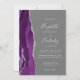 El borde izquierdo de esta elegante y moderna invitación a la boda incluye un borde de ágata color púrpura adornado con un falso purpurina de plata. El texto del personalizable combina la escritura a mano gris plateado pálido, el copperplate y el cursiva en un fondo gris medio. El reverso proporciona espacio para los detalles del boda en un fondo gris sólido, junto con un código QR que los huéspedes pueden explorar para visitar su sitio web y RSVP, lo que ahorra el coste de imprimir y enviar por correo tarjetas RSVP separadas.
