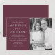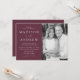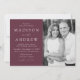 Invitación a una boda fotográfica moderna con los detalles de su boda a la izquierda del diseño con letras blancas con acentos caligráficos en un fondo de color púrpura. Personalice la parte delantera de la invitación añadiendo sus nombres, detalles del boda y fotos verticales de compromiso. La parte posterior de la invitación proporciona espacio para texto y fotos adicionales. Diseñado para coordinar con nuestra colección de bodas Modern Elegance.