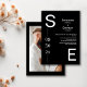 Esta sencilla y moderna invitación a la boda fotográfica muestra un fondo negro con caligrafía blanca e iniciales modernas, monograma. En la parte trasera puedes personalizar esta invitación de moda con tu propia foto.