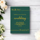 Esta elegante invitación a la boda de oro y verde es perfecta para un boda moderno. el diseño es sencillo, con una elegante caligrafía de oro sobre un fondo verde.