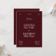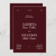Haz una declaración audaz y atemporal con esta elegante invitación a la boda. Diseñado con un fondo vino tinto profundo y un refinado serif emparejado con una elegante tipografía de escritura, este patrón es perfecto para bodas formales, recepciones nocturnas o celebraciones de viñedos. La rica paleta de color burdeos y marfil crea un ambiente sofisticado, mientras que la disposición limpia y equilibrada garantiza que los detalles se destaquen. Personalizable completo: personaliza con tus nombres, fecha de boda y detalles del lugar. Se coordina con la suite de papel boda "Sabrina" completa para un aspecto cohesivo y elevado.