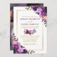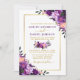 La tarjeta acuarela morada Ultra Violeta Floral y Gold Wedding incluye flores moradas y vegetación botánica. Foto de vuelta.
