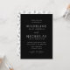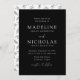Elegantes y modernas invitaciones nupciales con detalles bodas con letras blancas y caligrafía escrita a mano que realzan el diseño. Las invitaciones simples a la boda tienen un fondo negro. La boda en blanco y negro invita a revertir para mostrar un hermoso patrón follaje. Las invitaciones son perfectas para bodas de primavera y verano en el jardín.