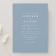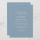 Esta sencilla y minimalista plantilla de invitación a la boda azul polvorienta es perfecta para una boda de primavera, verano, otoño o invierno. El guión moderno de caligrafía de la letra se empareja maravillosamente con una fuente serif tradicional.