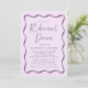 Invite a sus huéspedes a su cena de ensayo con estilo, con nuestras invitaciones para la cena de bodas de Modern Purple Wavy Frame. El diseño presenta las palabras "Cena ensayada" que se muestran en un guión púrpura escrito a mano que contrasta con un fondo púrpura claro. Los detalles del ensayo de la cena están rodeados de un borde violeta. Esta cena retro es perfecta para cenas informales y modernas.