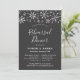 Moderno ensayo de boda temática invernal, invitación a cenar con falsos copos de nieve purpurina plata sobre fondo gris carbón. Esta tarjeta de plantilla se puede editar fácilmente en línea. La parte trasera de la tarjeta es de color negro y blanco.