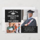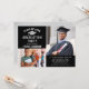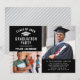 Anuncie su graduación con estilo con esta moderna pero elegante invitación a la fiesta de graduación. El diseño presenta un fondo negro con dos espacios para fotos senior, una redacción en blanco y gris plateado que puede ser personalizada con la información del graduado y los detalles del fiesta, y un patrón simple de rayas diagonales blancas en la parte posterior de la tarjeta. Se pueden personalizar el texto y los colores de fondo.