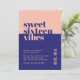 ¡Celebra el estilo de los 16 años de tu hija o ser querido con nuestra Invitación de cumpleaños rosado 'Dulce y Dieciséis'! Esta invitación moderna y audaz es la manera perfecta de marcar el tono de un fiesta dulce y memorable de dieciséis. Diseñada con vibrantes tonos azul y melocotón y llamativos tipos de letra contemporáneos, esta invitación rebosa energía y emoción juvenil, lo que lo convierte en una elección ideal para cualquier celebración dulce de dieciséis años.