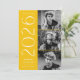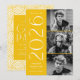 2025 invitaciones a fiestas de graduación con las tres fotos del graduado ubicadas a la derecha del diseño en un diseño vertical. El 2025 se exhibe con letras blancas y modernas, de fondo amarillo. Personalice la invitación de la moderna fiesta de graduación con fotos agregando el nombre del graduado y el nombre de la escuela. El diseño se revierte para mostrar los detalles de tu fiesta de graduación con un fondo geométrico amarillo y blanco. ¡Perfecto tanto para graduados de secundaria como universitarios!